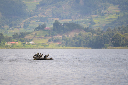 Lake Bunyonyi, Uganda - June 15, 2022: A group of cormorants sitting on a wooden post in Lake Bunyonyi in Uganda
