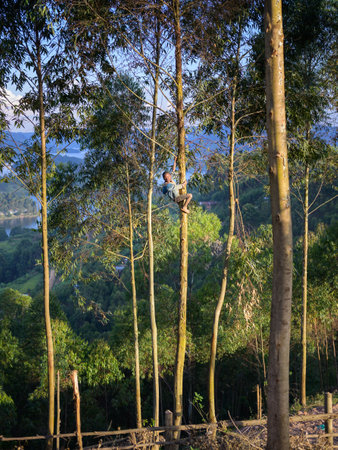 Lake Bunyonyi, Uganda - June 15, 2022: Little ugandan child climbing on a tree to collect firewood