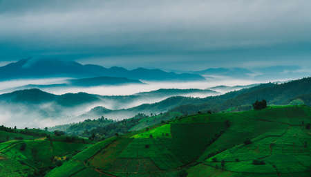 view of green rice fields terrace mountain in countryside Land with grown plants of paddy and sea of fog at Pa Pong Piang, Thailand.
