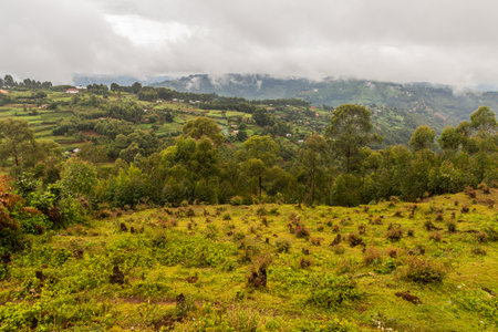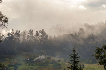 Hazy and misty sunrise over the farmlands at the Andean central mountains of Colombia near the town of Arcabuco