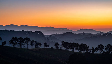 A scenic landscape showcases rolling hills under a vibrant sunrise. The composition features layers of hills, shrouded in mist, illuminated by warm golden and orange hues. The image captures a sense of serenity and vastness, suitable for various editorial and commercial applications. The atmospheric conditions create a dynamic, textured scene.