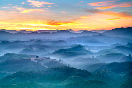Fanciful scenery of an early morning when the sun rises over the Dai Lao mountain range, Bao Loc district, Lam Dong province, Vietnam