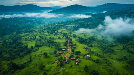 A breathtaking aerial view captures a misty village nestled among mountains, creating a serene and picturesque scene perfect for travel and landscape imagery.
