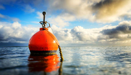 Closeup and bottom view of a red and orange large buoy for mooring boats on the surface of the water. On the horizon a beautiful blue sky with clouds and copy space. Generative Ai.