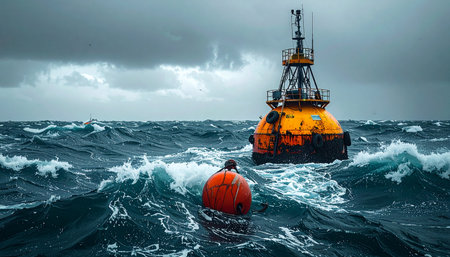 maritime marker amidst turbulent waters, research and navigation marker amid choppy deep blue ocean waves