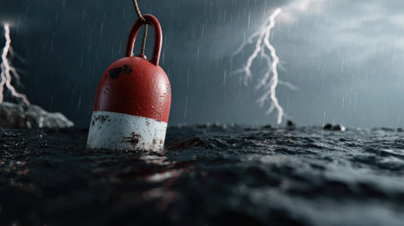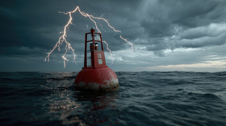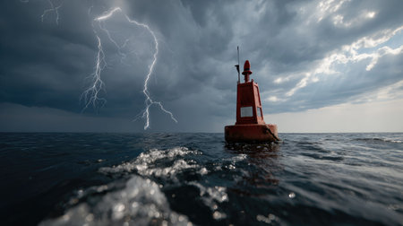 A captivating scene of a red buoy floating in stormy waters, set against a backdrop of dark clouds and striking lightning. Nature's powerful display.