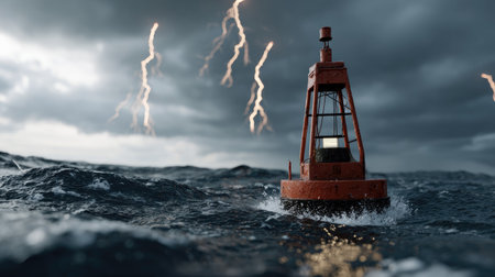 A striking scene of a buoy amid turbulent ocean waters, surrounded by dark clouds and dramatic lightning. The image captures the raw power of nature.