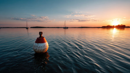 A tranquil scene capturing a buoy floating in calm waters under a stunning sunset. The soft reflections create a serene atmosphere ideal for nature lovers.