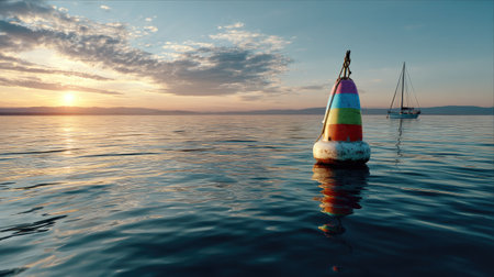 A vibrant, colorful buoy floats serenely in calm water during sunset, with a distant sailboat enhancing the tranquil evening seascape.