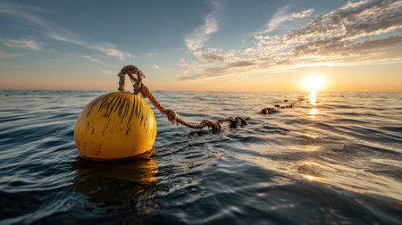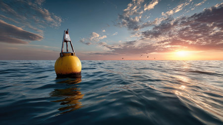 A serene scene featuring a bright yellow buoy floating in calm ocean waters at sunset. The vibrant sky and tranquil atmosphere evoke a sense of peace in nature.