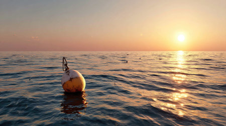 A tranquil scene showcasing a buoy floating gently in calm ocean waters during a vibrant sunset, casting warm reflections across the surface, evoking a sense of peace.