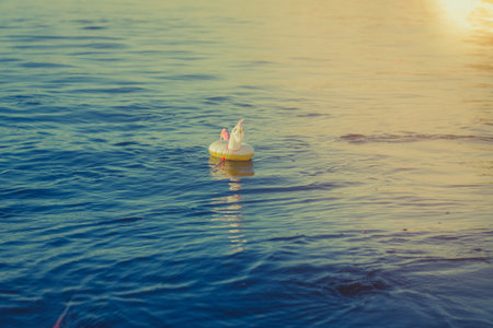 top view of a fishing float in shiny lake water, created with generative ai