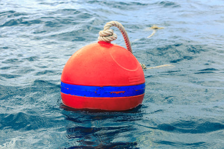 Red buoy floating on the surface of blue water in the sea.