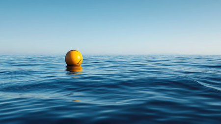 A vibrant yellow buoy floats effortlessly on the calm ocean waters, reflecting the clear blue sky above. This serene coastal scene captures tranquility and natural beauty.