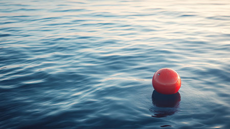 A vibrant red buoy rests peacefully on the calm blue water, creating a tranquil scene with gentle ripples and reflections, ideal for nautical-themed design or serene nature imagery.