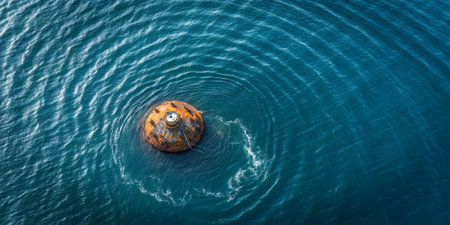 A rusted buoy floats steadily on tranquil blue waters, surrounded by gentle ripples. Sunlight reflects off the surface while the serene environment captures a peaceful moment on the ocean.