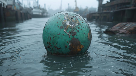A weathered globe floats in a harbor.