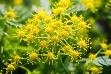 Close-up photo of dill flowers, with yellow stigmas on top and green leaves in the background. --ar 3:2 --v 6.1 Job ID: 8e320335-1beb-4cdd-b2dc-cd77de419a65