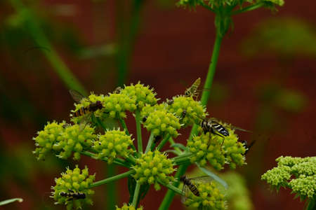 Heracleum sosnowskyi, Sosnowsky's hogweed, giant heads of cow parsnip seeds, a poisonous plant family Apiaceae on a meadow against grass with Graphosoma lineatum