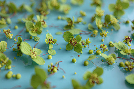 Close-up view of various small, vibrant green flowers and leaves, arranged in a scattered pattern, on a smooth, light teal surface or background. The flowers appear delicate and fresh. The surface appears to have a slight sheen or reflective quality. Small, light green dots or spheres are also scattered throughout the image.