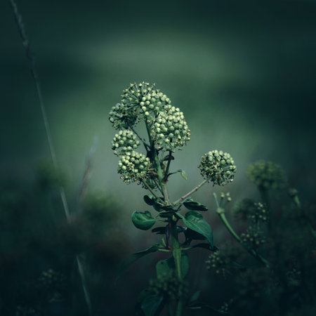 Delicate green buds emerge on a plant showcasing intricate textures and forms against a softly blurred dark backdrop in early spring.