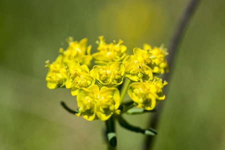 Euphorbia cyparissias, cypress spurge greenish flowers closeup selective focus.