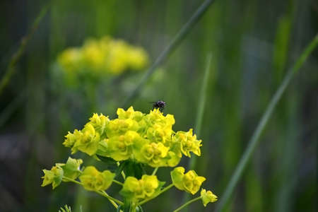 Beautiful yellow blooming flower Euphorbia cyparissias L and on it rests a fly outside in the woods.