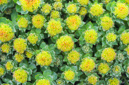 Sunlit light green spurge flower buds background. Abstract nature and herbs textures