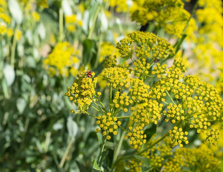 Yellow flowers of dill, Anethum graveolens. close up. In the open ground in the garden grows vegetable dill.