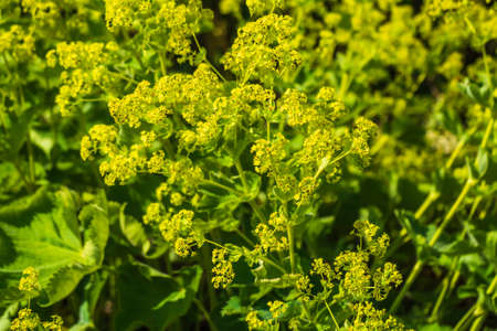 Flowers of a wild toxic plant Euphorbia cyparissias. Cypress Spurge / Euphorbia Cyparissis blooms among herbs. detail of cypress spurge flowers