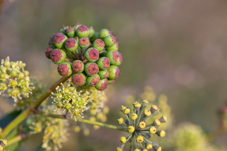 Flowers and buds on blooming Siberian Hogweed, Heracleum sibiricum, macro, selective focus, shallow DOF.