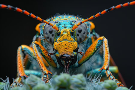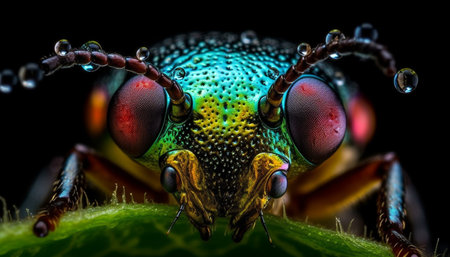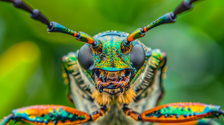 Vibrant macro shot iridescent beetle close up in jungle setting, gazing at camera