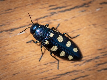 A beautiful black jewel beetle (Buprestis octoguttata, Buprestidae) with yellow spots sitting on wood