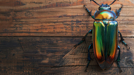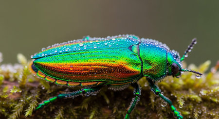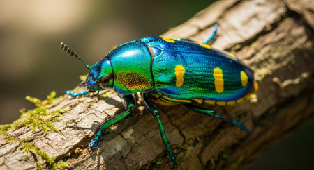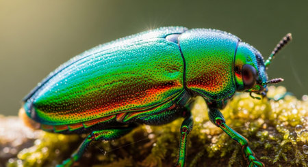 A stunning macro shot of a colorful beetle resting on a mossy log, showcasing intricate details and vibrant colors that highlight nature's beauty.