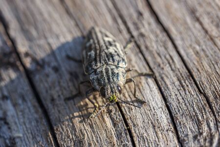 Chalcophora mariana on a dry pine trunk. Macro top view of a Buprestis mariana beetle sitting on a kitchen trunk of pine