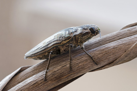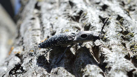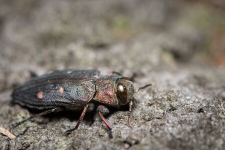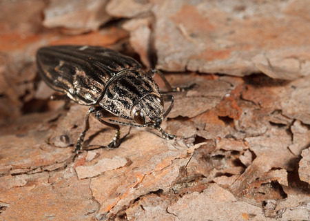 Macro of borer beetle (Buprestis mariana) on bark of pine tree