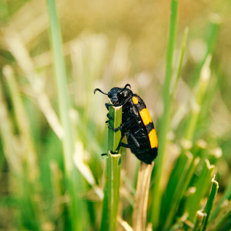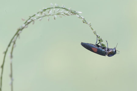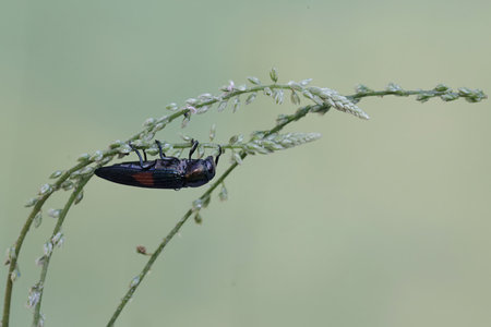 Beetle crawling on a stalk of grass .Insects are very active during the day.The Latin name for the beetle is Ctenicera pectinicornis.