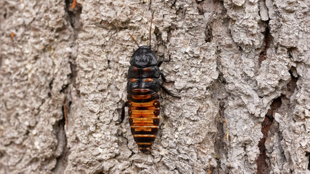Big black madagascar cockroach crawling and running in natural habitat, insect wildlife documental footage, close up shot of cockroach crawling on the tree outdoors.