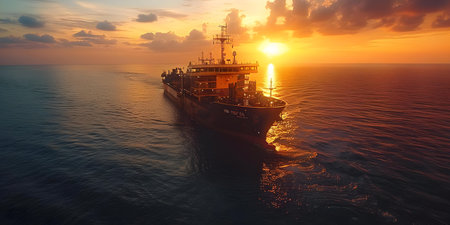 A striking cargo ship floats serenely on the water as the sun sets, casting warm hues across the sky and creating a reflective surface, symbolizing maritime industry.