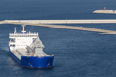 MARITIME TRANSPORT - The ship sails through the port channel to the transhipment terminal