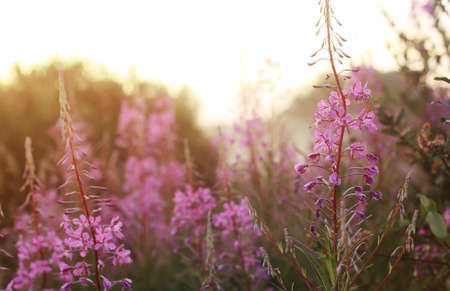 Beautiful flowers in the meadow at sunset. Natural background.