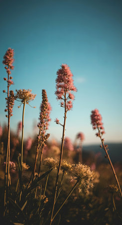 Wildflowers with pink blossoms are swaying in the gentle breeze beneath a clear blue sky, showcasing a peaceful and vibrant natural scene filled with beauty, AI generated