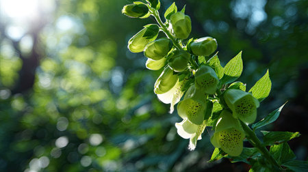 The Foxglove in spring, fresh green leaves, soft sunlight filtering, vibrant atmosphere full of vitality, natural textures, serene mood.