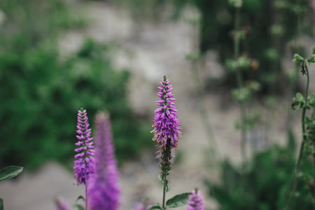 Beautiful veronica blooming in english cottage garden. Close up of purple veronica spicata flower. Floral wallpaper. Homestead lifestyle and wild natural garden