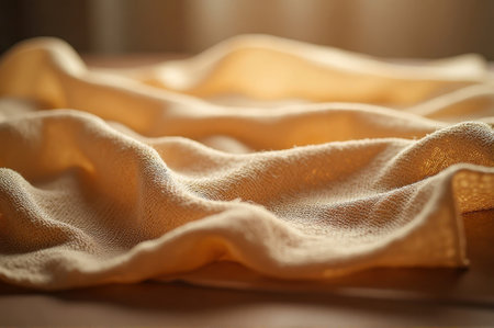 Close-up of crumpled beige fabric with warm lighting. That the image is generated using AI.