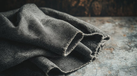 A close-up of folded black linen fabric, lying on a textured surface, highlighting the material's texture and quality in a minimalist composition.