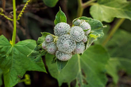 Close up of the buds of a Burdock plant with green leaves