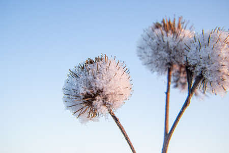 Frost and snow covered thistles in a wild field in winter.