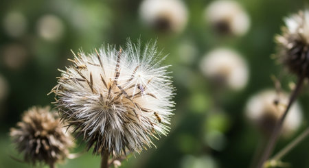 A detailed close-up captures the intricate beauty of a thistle seed head, showcasing its fluffy texture against a blurred green backdrop, highlighting nature's artistry.