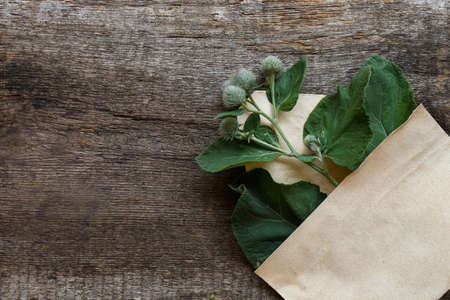 Fresh green burdock leaves and flowers in envelope on wooden table, top view. Space for text